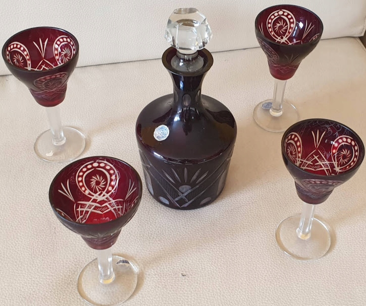 Karafka wysoka 33cm, o niepospolitym kształcie przykryta potężnym korkiem. Wyrób z połowy xxw ze słynnej rumuńskiej wytwórni buzau perla lux. Cristal carafe serti de 6 verres à liqueur améthyste coupe à effacer buzau perla lux. Karaffe + 5 x likörglas perla lux buzau böhmen überfang rubinglas vintage. Vintage κρύσταλλο ρουμανίας εταιρείας buzau perla lux, διπλή στρώση κρύσταλλου: